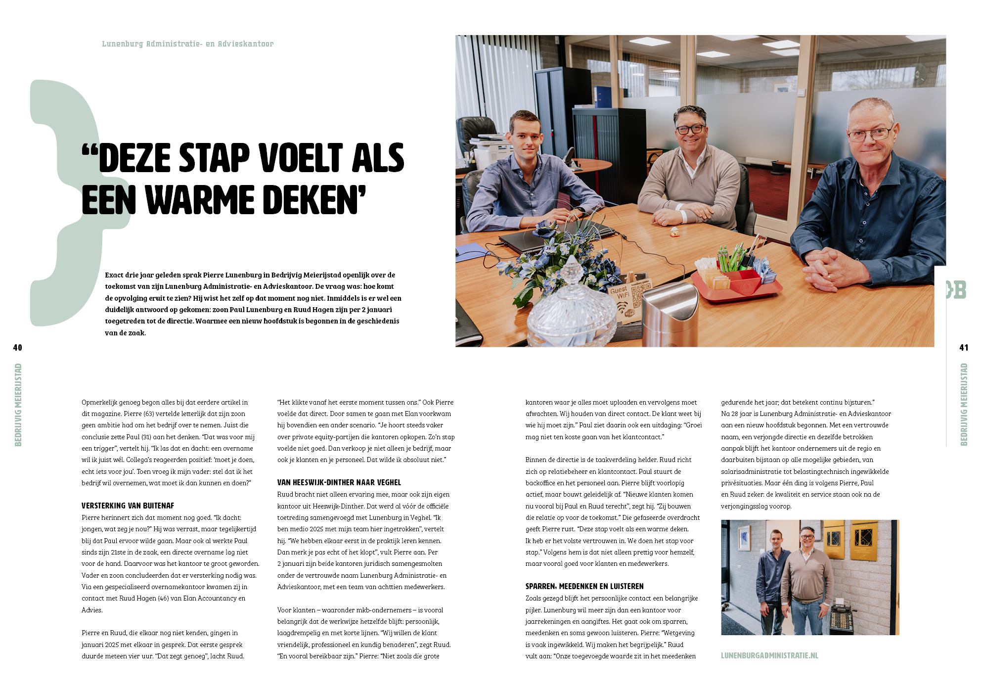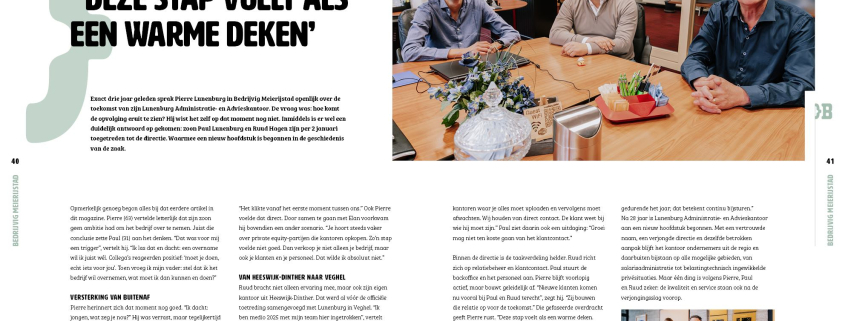 “Ik ben erg enthousiast over Lunenburg Administratie- en Advieskantoor en de stappen die we de komende jaren willen maken. Vanaf het eerste uur voel ik me er thuis en krijg de ruimte om mee te bouwen aan deze fijne organisatie”, vertelt Hagen. Lunenburg vult aan: “Inmiddels werk ik ook alweer ruim tien jaar in het bedrijf van mijn vader en weet dus waar ik aan begin. Door de toetreding tot de directie laten we zien dat onze focus op de lange termijn ligt. We kiezen bewust voor een volgende generatie waarbij we de vrijheid behouden zonder toetreding van private equity. Hierdoor blijven we de vertrouwenspartner voor onze klanten en blijven we onderscheidend voor de medewerkers.”